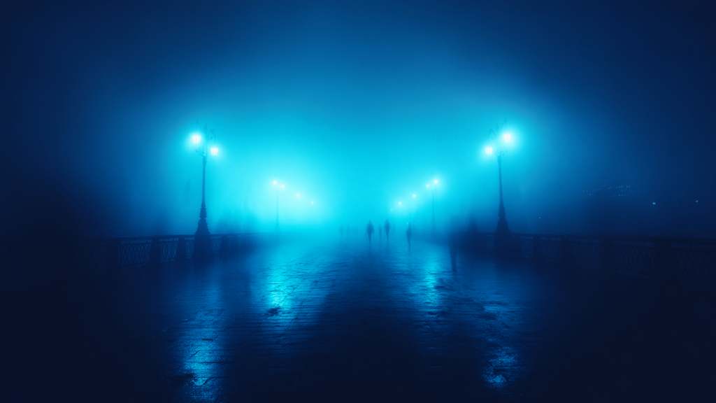 Two figures walking through fog.